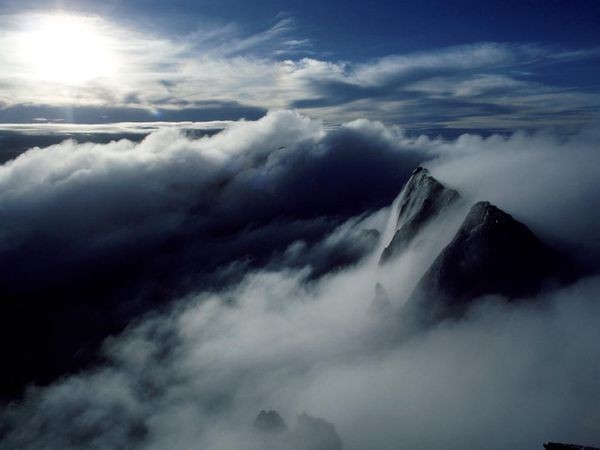 Mountain peaks and low lying clouds